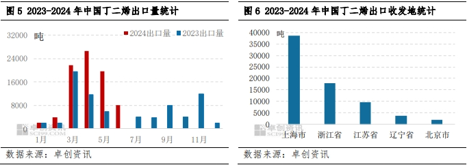 2024年上半年,国内丁二烯出口数量明显增加。据卓创资讯预测,2024年上半年丁二烯累计出口预计8.2万吨附近,同比增长96.6%,增幅明显。目前国内丁二烯资源出口主要集中在中石化、浙石化、盛虹炼化、恒力石化等生产企业,这部分丁二烯资源的集中出口,导致该部分厂家现货外销量明显减少,一定程度上加剧国内货源供应紧张局面,对国内市场价格亦存在较强提振。