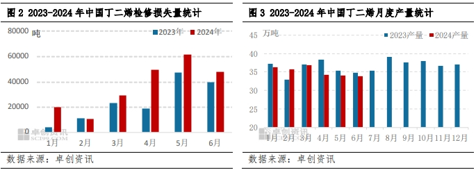 2024年上半年国内丁二烯产量同比去年有所下滑,由于裂解装置持续亏损,国内外裂解装置整体开工积极性不高。1-6月份国内部分丁二烯装置存在计划内外停车等,且由于效益问题,国内部分小乙烯裂解装置长期停车,导致上半年丁二烯检修损失量较去年同期明显增加。据卓创资讯统计数据显示,2024年上半年,国内丁二烯装置检修损失总量在21.78万吨,较去年上半年增加7.42万吨,增幅52%。上半年国内丁二烯总产量在212万吨,较去年同期下滑1.85%。且新装置方面,上半年暂无新装置投产,山东金诚石化丁二烯装置试车但无优级品产出,装置再次试车时间计划在四季度。目前来看多数新装置投产时间集中在四季度,亦难对上半年丁二烯市场货源存在有效补充。