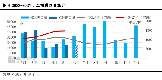 2024年上半年,国内丁二烯进口货源数量有限。虽1-2月份丁二烯进口量同比去年走高,但是3月份开始,丁二烯进口货源数量出现下滑,尤其是5-6月份,进口货源难对国内市场存在有效补充。年内整体来看,远洋货源由于对东北亚补充减少,且东南亚地区由于裂解装置运行减少,市场可售量亦不多,对东北亚市场补充有限。卓创预计,2024年上半年丁二烯进口量在16万吨附近,同比下滑5.9%。