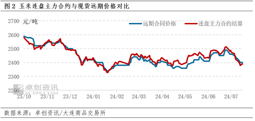 导致7月中旬东南沿海玉米价格回落的因素较多,其中较为主要的是期货盘面的回落,引发市场贸易心态的变动。7月中旬连盘玉米合约均有不同程度的下跌,7月16日连盘主力09合约盘内最低价格跌至2365元/吨,较7月10日结算价格2424元/吨下跌59元/吨,而当日对标的北方港口价格为2370元/吨,若考虑时间成本与仓储成本,主力09合约期现贴水接近50元/吨,对现货市场心态形成较强的利空影响。随后期货出现窄幅回升,截至7月19日,连盘玉米主力09合约结算价2391元/吨,虽有回升但与现货依旧存贴水空间。