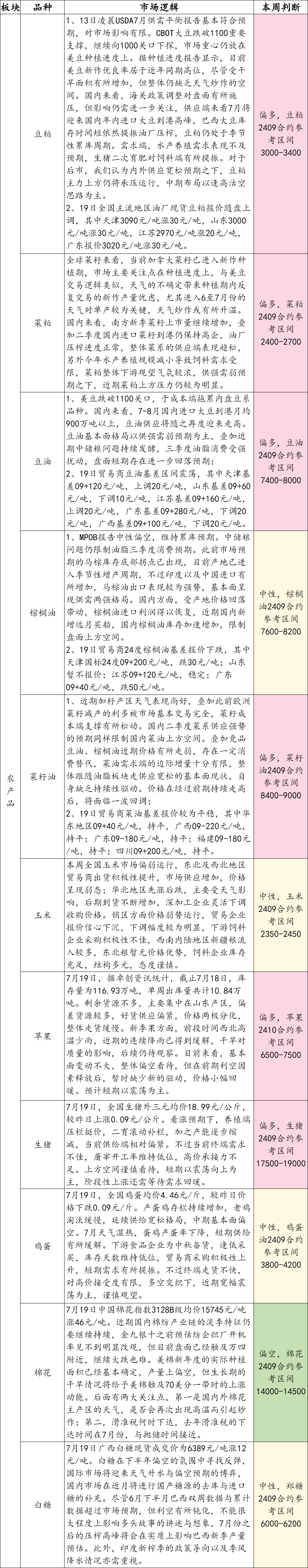 【农产品】行情提示及操作建议2024/7/22