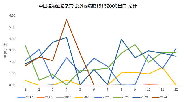 这个类目项下主要是氢化植物油脂,2024年上半年主要是往欧盟出口,月均出口量大致为2万吨,因此后续关注最终的调查结果和关税的设定,注意对植物油的需求的边际影响。