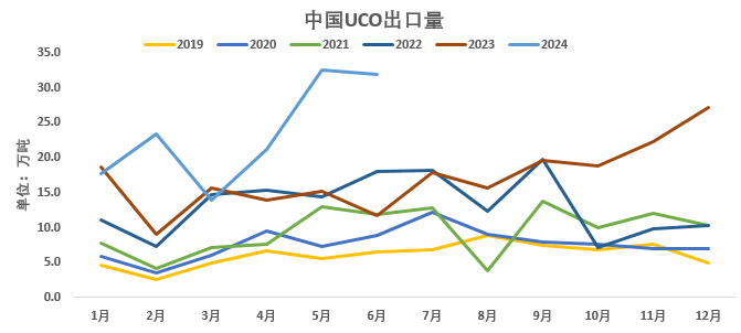 根据UCO得率85%以及废油脂转酯化率99%来粗略的估算,2024年上半年往欧盟市场出口的生物柴油折算成UCO原料,月均用量大致为11万吨,生物柴油加征临时关税,后续出口需求减少的话,也要注意对国内植物油的边际需求也会产生不利的影响。