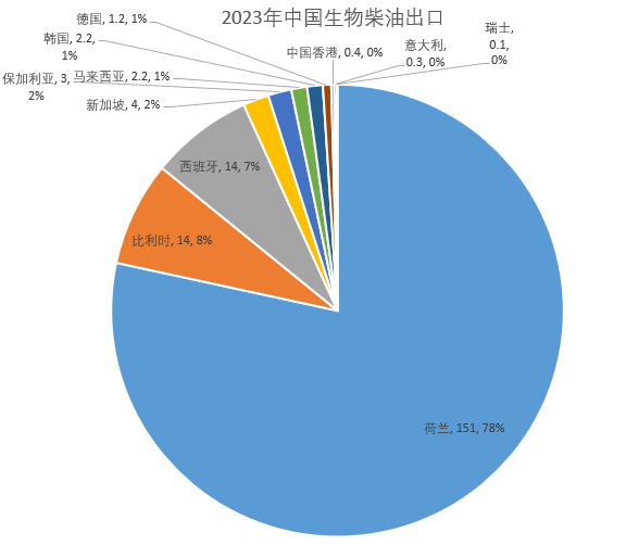 中国HS38260000项下的货物主要出口到欧盟市场。2023年中国出口了生物柴油195万吨。其中主要出口目的地是荷兰,出口了151.4万吨,占中国出口总量的比重为78%。其次是比利时和西班牙,分别出口了14.4万吨和14.2万吨,占中国出口比重分别为7.4%和7.3%。保加利亚、德国和意大利也少量进口了中国的生物柴油,分别为3.2万吨、1.2万吨和0.3万吨,上述欧盟成员国合计占比95%,合计向其出口了185万吨。