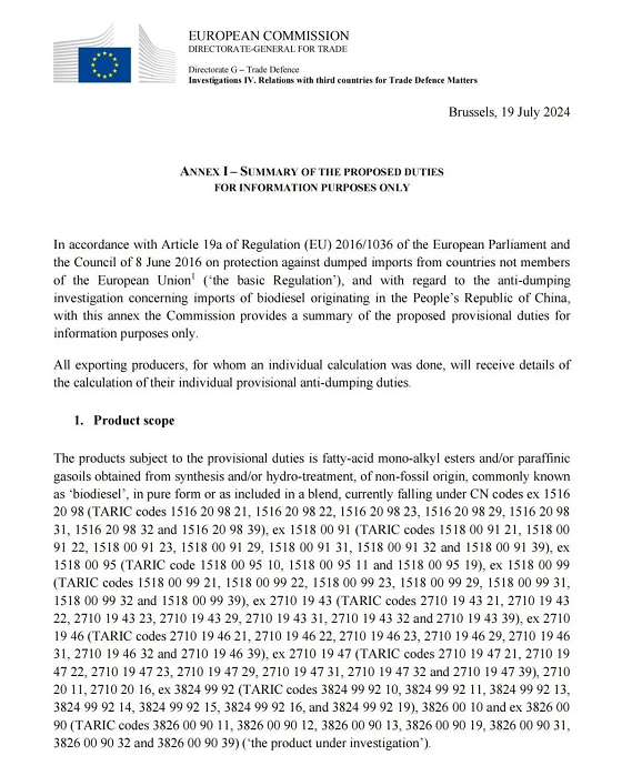 1、欧盟将对中国生物柴油征收临时关税,欧盟委员会已提议对中国生物柴油(HVO和FAME均包含)征收12.8%-36.4%的临时关税。这些关税将于8月中旬实施。欧盟将中国可持续航空燃料(SAF)排除在这些临时措施之外。对中国的反倾销调查将持续到2025年2月,届时可能会确定为期五年的最终关税。