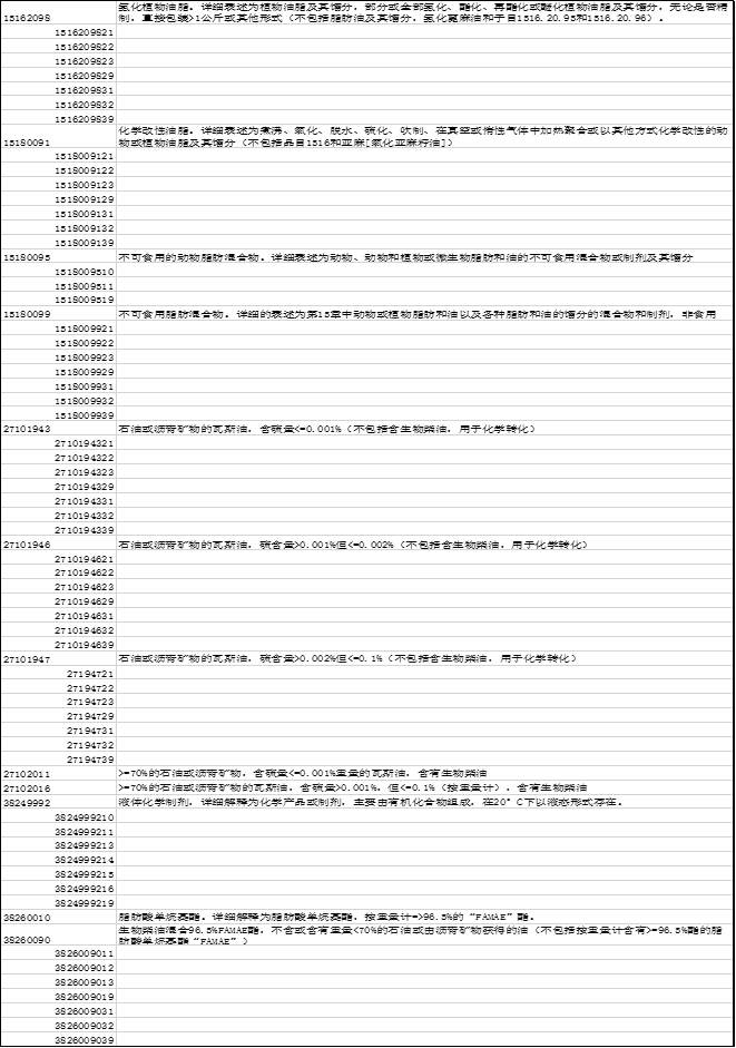 我们对应了中国的HS38260000类目-生物柴油及其混合物,不含或含有按重量计低于70%的石油或从沥青矿物提取的油类。
