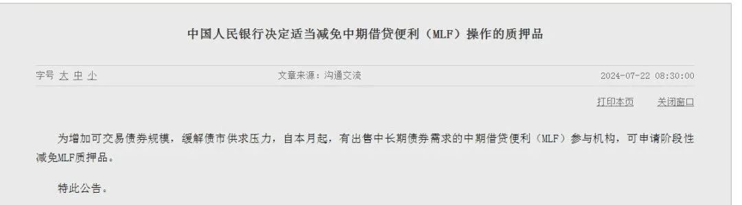 此外,同日央行官网发布新闻稿,宣布对卖出中长期债券的MLF参与机构,阶段性减免MLF质押品。