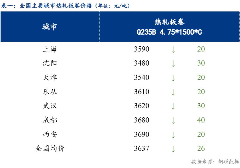 今日热轧板卷全国主要城市价格继续下行,截止发稿时3.0mm热轧板卷全国均价3699元/吨,较上一交易日跌26元/吨;4.75mm热轧板卷全国均价3637元/吨,较上一交易日跌26元/吨。分区域来看,今日各地市场普遍下行,下跌幅度在0-50元/吨左右。今日黑色商品期货震荡运行,10合约收跌0.74%,现货市场早盘价格普遍下行,成交较弱,午后盘面震荡,尾盘跳水,现货价格继续下行,市场成交继续趋弱,暗降出货情况较多。