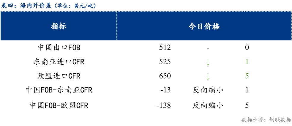 从海内外价差情况来看,中国热卷出口价格报512美元/吨左右,较上个交易日暂稳,欧盟进口价格650美元/吨,较上一交易日下跌5美元/吨。