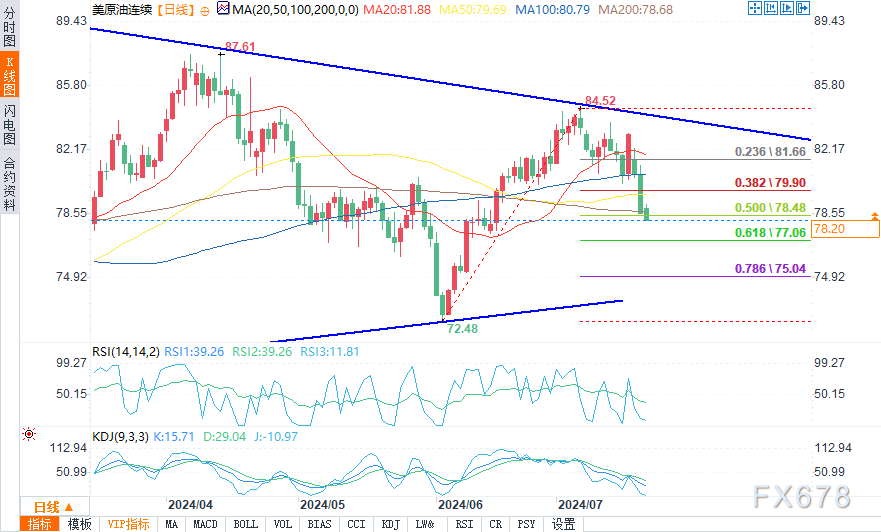 在首次测试77.95-77.75美元的支撑时,预计会出现技术反弹。考虑到目前的指标和地缘政治的不确定性,如果跌破这一支撑区域,市场可能会走低。
