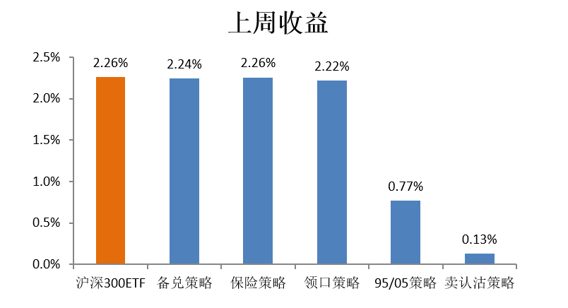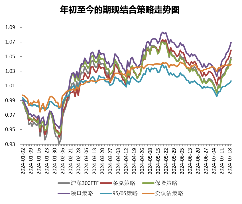 我们对期现结合的五个策略(备兑、保险、领口、95/05配置、卖认沽)及沪深300ETF现货,在上周(2024.7.15-2024.7.19)的表现进行了回测。上周沪深300ETF现货上涨,由于临近行权日,备兑、保险、领口策略持有的期权虚值程度较深,故策略收益与现货收益接近。具体结果如下: