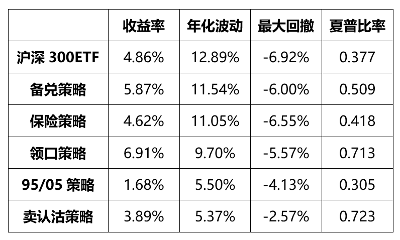 备兑、保险、领口策略建仓及调仓方法:组合基日为2023年1月3日,以收盘价买入1万份300ETF现货,备兑策略以收盘价备兑卖出开仓1张当月虚值5%的认购合约,保险策略以收盘价买入开仓1张当月虚值5%的认沽合约,领口策略以收盘价买入开仓1张当月虚值5%的认沽合约并备兑卖出开仓1张当月虚值5%的认购合约。此后在每个月期权合约到期日前一周的最后一个交易日进行调仓,以收盘价平仓已持有的期权合约,并以收盘价建仓相应的下月合约。ETF分红等事件出现时,使用获得的红利买入ETF进行再投资,保持期权合约对应的ETF份数和持有的ETF一致。旧合约仍持有到期,不向新挂牌合约展期。当保险策略和领口策略所持期权收益率超过50%时,期权进行止盈平仓。