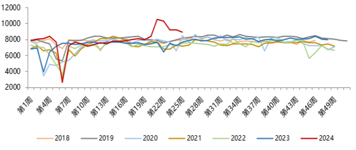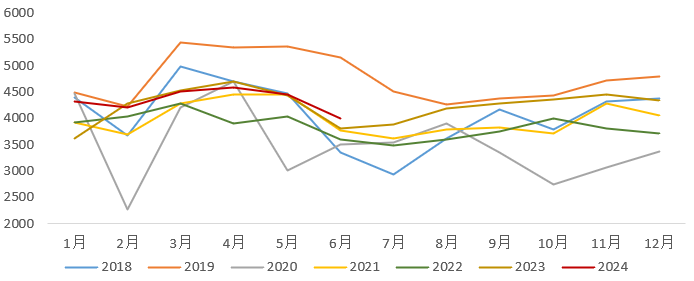 鸡苗补栏:卓创数据显示,2024年1-6月鸡苗补栏同比2023年同期增长2.72%,鸡苗补栏量绝对值处于历史偏高位置。上半年蛋鸡苗价格先涨后跌,主要跟随鸡苗季节性补栏波动为主(上半年补栏旺季,下半年淡季),其中4月受现货下跌超预期影响,鸡苗补栏略有下滑,补栏量仅高于2021、2022年同期水平,5月后随着现货价格回升养殖利润好转,市场养殖情绪转向乐观,但由于天气等因素影响,鸡苗补栏出现了季节性下行趋势,但不改上半年整体补栏量偏多的事实。上半年补栏鸡苗量对应下半年的蛋鸡新开产量,因此下半年新开产量预计仍偏多(部分月份可能出现环比减少,但不改总量偏多的事实)。