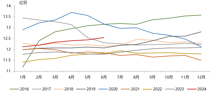 注(鸡龄结构):截止2024年6月,蛋鸡存栏12.55亿羽,仅低于2016,2020年同期水平,高于其他年份。大码蛋占比41%,中码鸡蛋占比44.76%,小码鸡蛋占比14.24%。450日龄以上老鸡占比8.91%,120日龄以下后备鸡占比13.86%,,120-450日龄产蛋鸡占比77.23%。整体鸡龄结构偏年轻。
