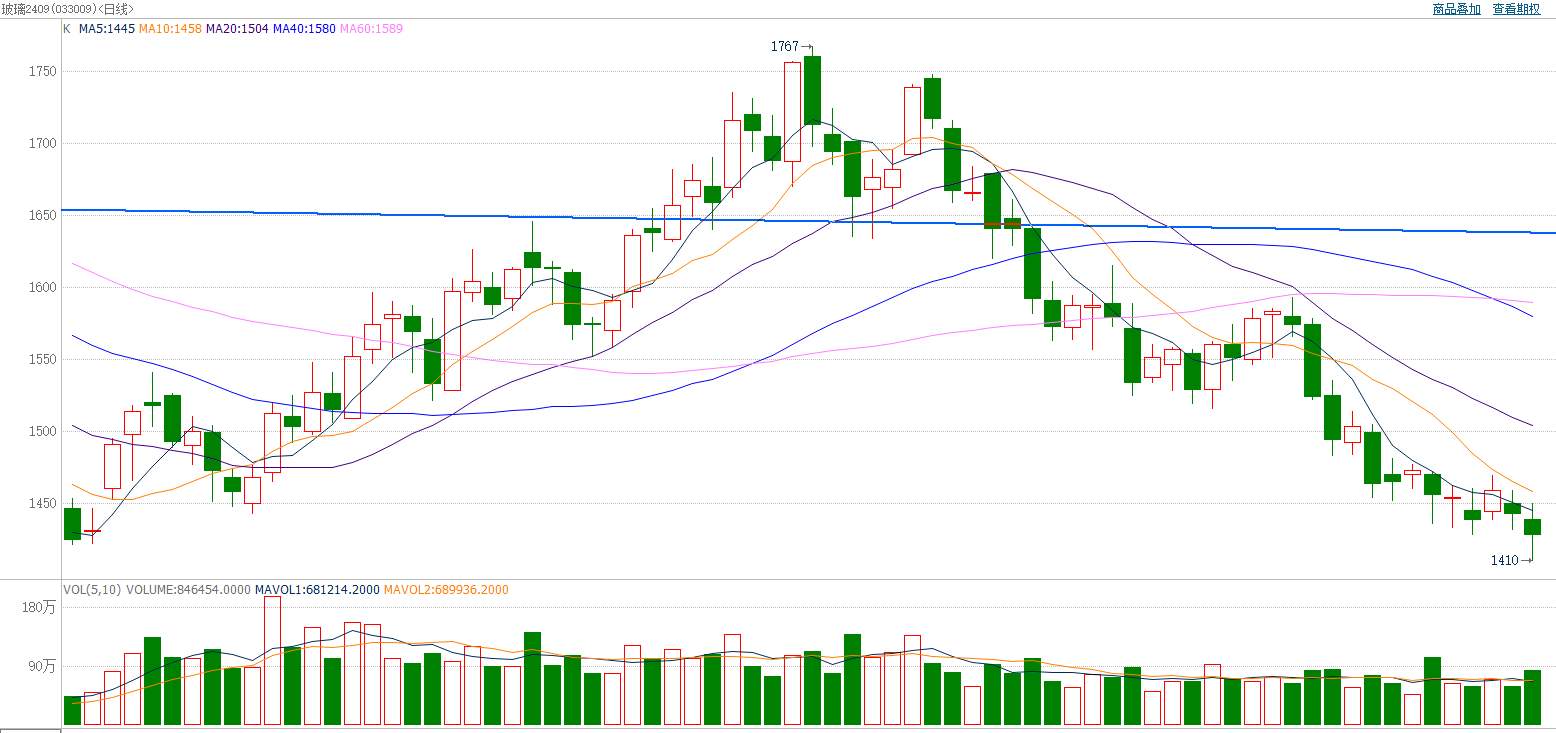截至前一个交易日收盘,玻璃低开低走,收小阴线。日k线近期窄幅盘整,下行趋势未改。