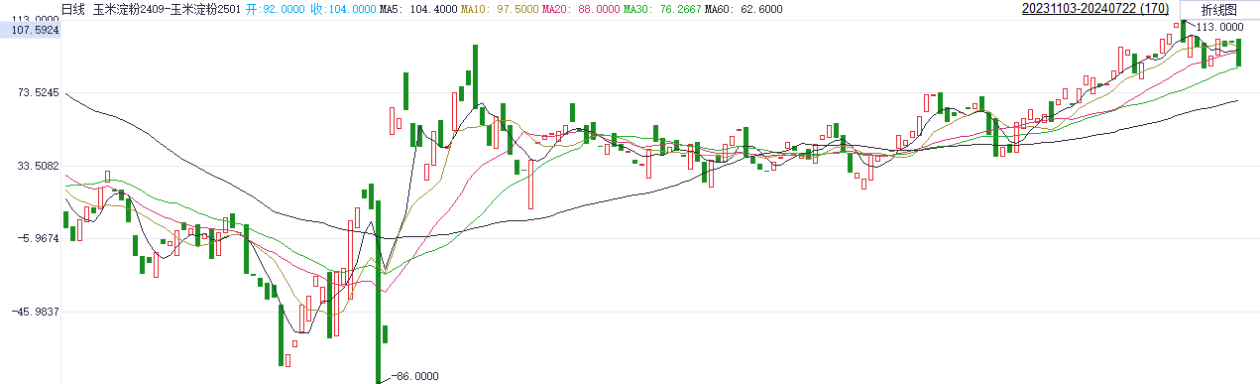 据卓创资讯数据显示,2024年上半年国内玉米市场均价为2317.87元/吨,同比跌幅15.18%,原料成本下跌是造成玉米淀粉上半年价格下行的主因。上半年全国玉米淀粉产区均价为3052.36元/吨,同比下跌3.29%。进入7月份主产区停产减产企业增多,供给端压力缓和。玉米价格反弹,成本支撑力度增强,供需矛盾适当缓解,玉米淀粉现货价格触底连续出现反弹。