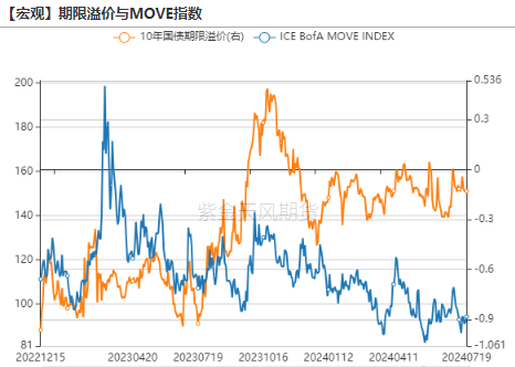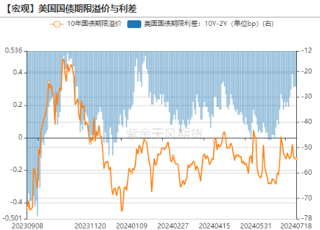 上周各期限美债收益率上行,2y UST上行幅度略高于10y UST,利差维持在28.2bps上下。自6月28日的总统选举辩论后,特朗普交易一度火热,推动美债收益率曲线熊陡,近期该交易趋缓。