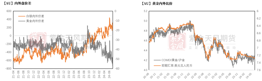 上周黄金内外价差先降低后回升,与特朗普弱美元言论有关;白银内外价差整周持平。