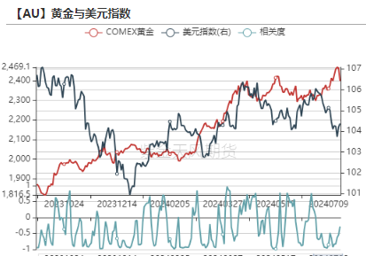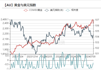 上周美元指数与黄金价格反向变动,黄金下跌0.42%,美元指数上涨0.26%至104.4,两者滚动相关性走低。