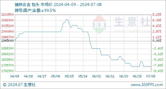 7月8日,生意社镝铁合金基准价为1790000.00元/吨,与本月初持平。