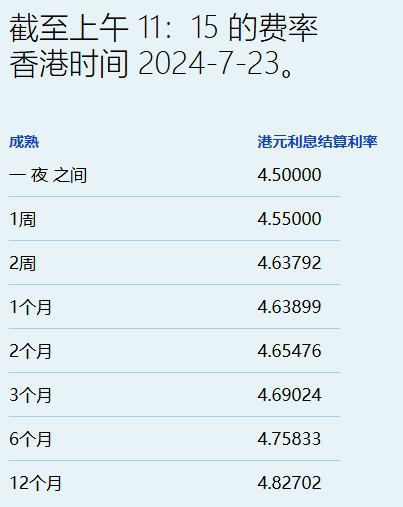 7月23日,港元拆息今早个别发展,隔夜息结束三连跌,升至4.5%,与楼按相关的一个月拆息亦中止两连跌,报4.63899%。