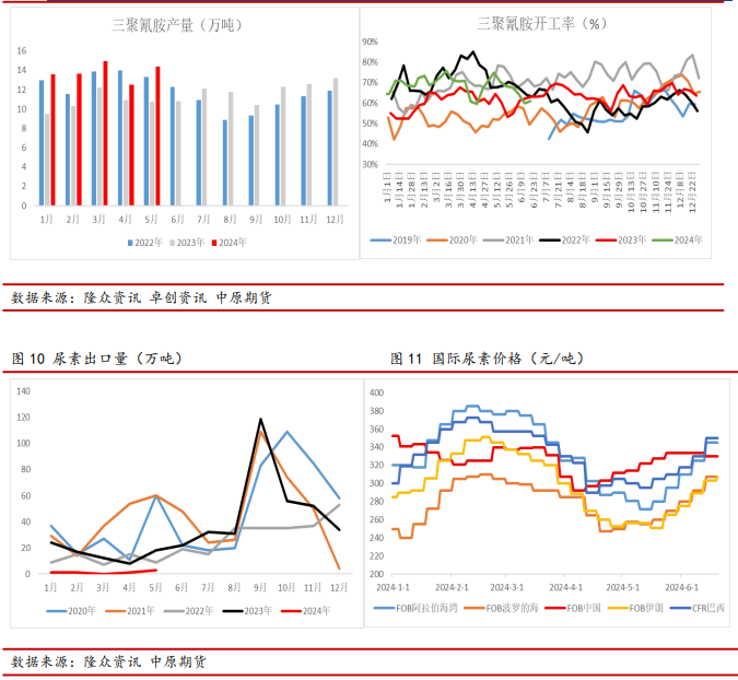 工业需求方面,2024年1-5月三聚氰胺累计产量为69万吨,同比2023年增加16万吨,对尿素消耗量约增加48万吨左右。此外,受国家环保政策影响,火电脱硝和车用尿素对尿素消费预计有明显增量,但其占尿素需求比重仍较小,对尿素需求增幅有限。整体来看,预计2024年工业需求对尿素消费存增量预期,但对尿素需求增幅有限,需求增速或不及供应增速。