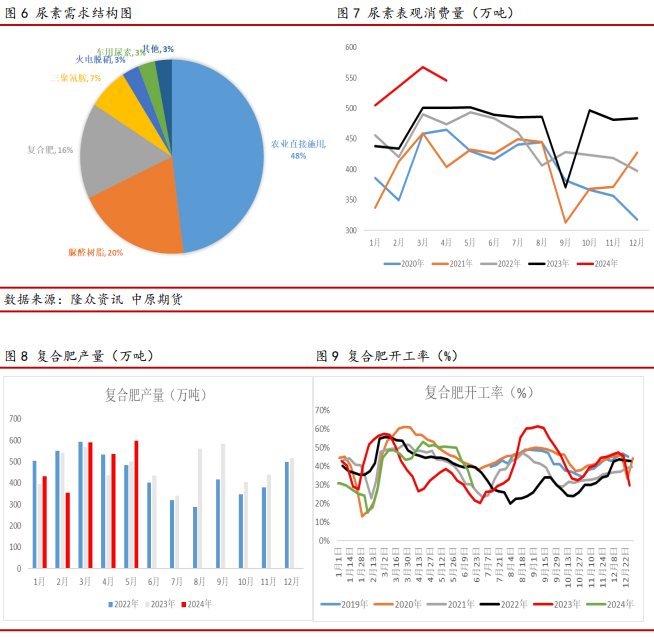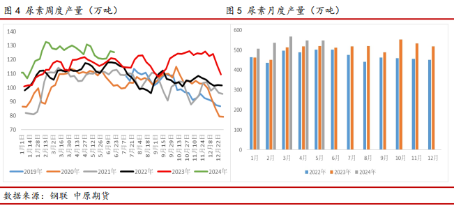 供应方面,随着2023年以来新增产能装置的陆续投放,国内尿素日产同比升至历史高位水平。据隆众资讯数据,2024年1-5月尿素累计产量为2705万吨,较2023年同期增加242万吨,同比增幅9.83%。分时期来看,受气头尿素检修装置陆续复产影响,1-3月份尿素行业日产持续回升至最高18.8万吨左右的历史高位水平。4-5月份尿素企业装置陆续进入集中检修阶段,叠加部分装置的故障短停,导致尿素行业日产出现阶段性大幅减量,现货短时呈现偏紧状态。直至5月下旬,随着前期检修装置的陆续复产,尿素产量进入逐步回升阶段。