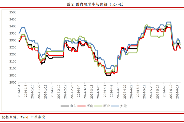 现货价格方面,国内主流区域市场价格最高在6月份的2390元/吨,最低在4月份的2050元/吨,单吨波动幅度约为340元。