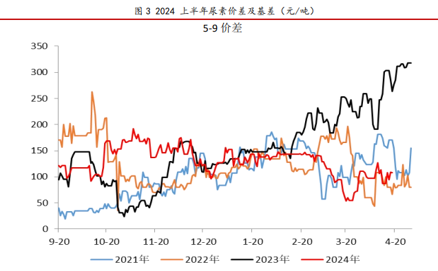 2024年上半年尿素5-9价差整体呈现“V型”走势,主要原因在于三月份以后现货价格大幅下降,带动近月合约转弱,导致5-9价差大幅走弱。而4-5月份受复合肥集中生产带动原料行情上涨影响,近月合约持续上涨,带动5-9价差从低位持续走强。
