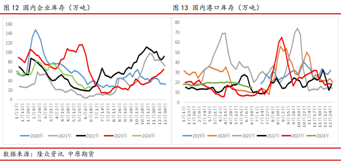 库存方面,2024年上半年尿素企业库存基本符合往年季节性走势,上半年整体处于去库趋势,4-5月库存去化速度较快,下半年存季节性累库预期。从目前库存结构来看,上游尿素工厂库存仍偏低,尿素价格弹性较大。港口库存方面,由于上半年出口政策收紧及国内外价格倒挂,出口预期较差,尿素港口库存持续处于低位水平。