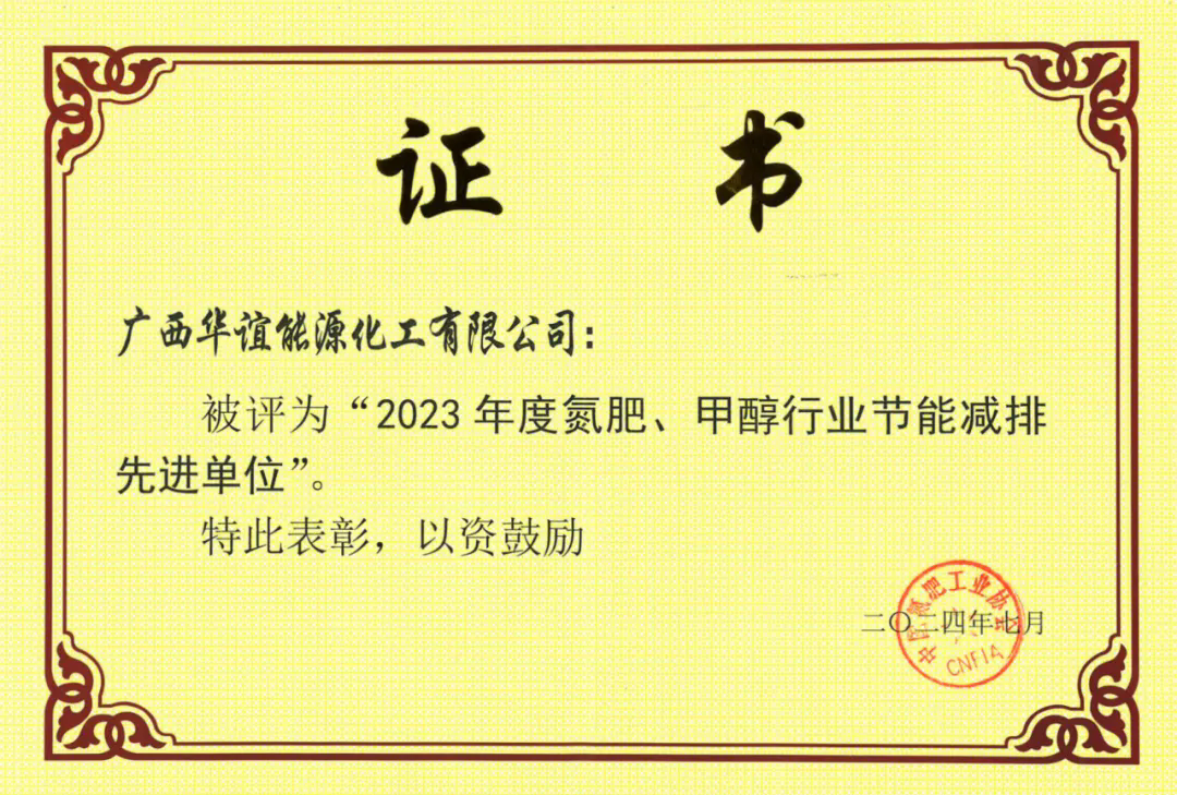 广西华谊能源化工有限公司被评为“2023年度氮肥、甲醇行业节能减排先进单位”