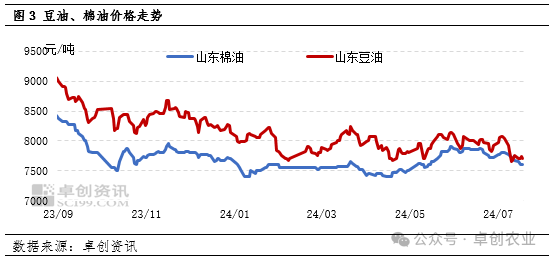 因下游消费领域基本一致,国内豆油与棉油具有一定的相互替代关系,而豆油作为主要的植物油品种且期现货交易活跃,豆油价格走势对棉油价格形成强有力的指引,两者价格趋势相同,且高度相关,近两年山东棉油与豆油价格数据相关性高达0.89。海关数据显示,6月进口大豆到港1111万吨,环比增长8.7%,同比增长10.7%,为本年度迄今最高单月进口量。6月以来,全国油厂每周大豆压榨量保持在200万吨以上,豆油产出供应无虞。截至7月16日,全国豆油库存为92.3万吨,较上月增加34.6%。7月进口大豆预估到港1150万吨,8月预估到港900万吨,油厂在到港压力下保持较高开机率。而需求淡季油脂消费较弱,短期国内豆油可能加速累库,从供需面来看,短期棉油价格上涨空间或有限,对棉油市场难以形成明显利多提振。