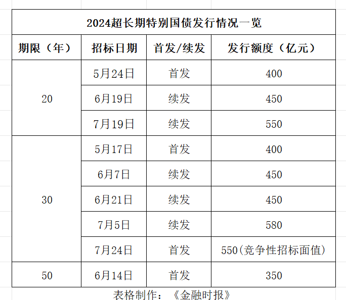 据《金融时报》记者统计,从5月17日财政部发行2024年超长期特别国债(一期)(30年期)以来,目前已累计发行八期、共计3630亿元超长期特别国债(不包含7月24日),专项用于国家重大战略实施和重点领域安全能力建设。