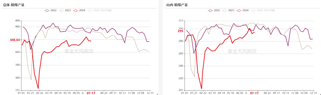 会议期间各地煤矿有主动控产行为,目前已基本恢复正常;上周原煤周产量867万吨,周环比-0.94万吨;精煤周产量446.64万吨,周环比-0.24万吨。