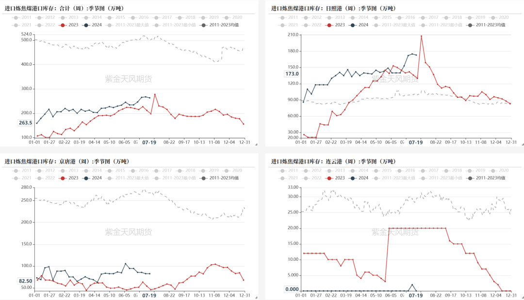 进口炼焦煤港口库存263.5万吨,周环比-4万吨。