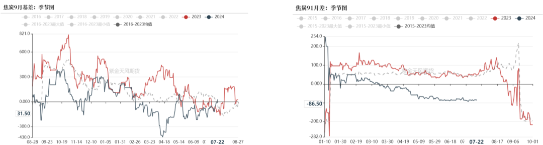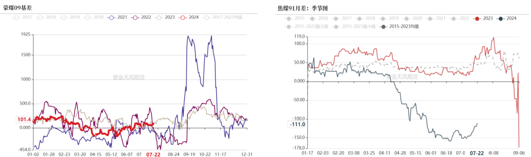 焦煤近期盘面震荡,基差70元左右;9-1月差近期震荡走强。