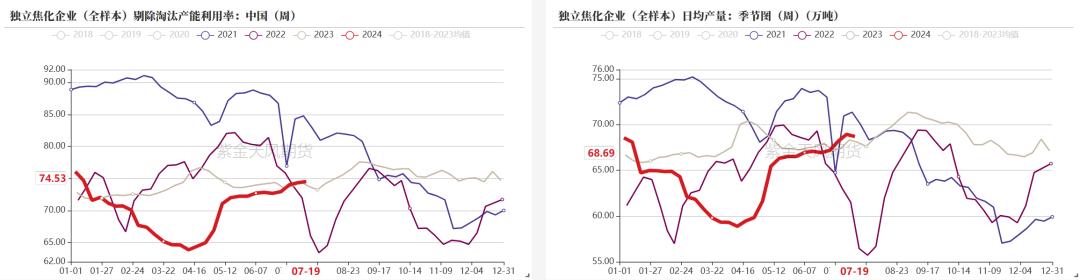 独立焦化企业(全样本)剔除淘汰产能利用率74.53%,周环比+0.19%;