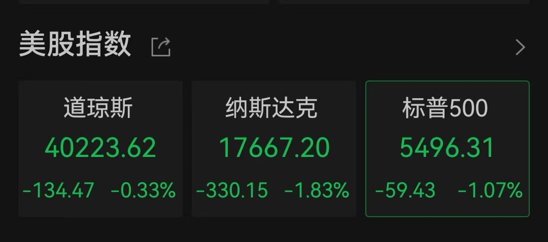 数据显示,截至北京时间7月24日21:40,美股道指跌0.33%,纳指跌1.83%,标普500指数跌1.07%。