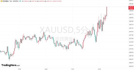 周三美盘,现货黄金重回2430美元大关,较日内低点上涨超20美元。