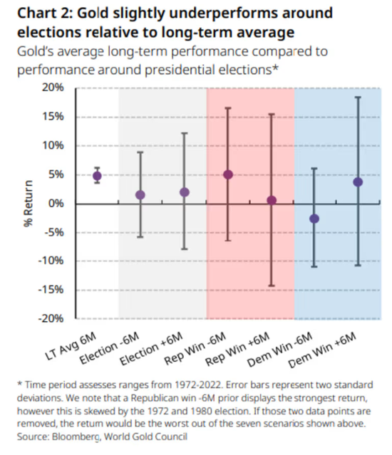 报告显示,黄金在共和党总统当选前六个月的表现略好,然后在大选后保持平稳。在民主党总统当选之前,黄金往往表现不佳,然后在大选后的六个月内表现略低于其长期平均水平。