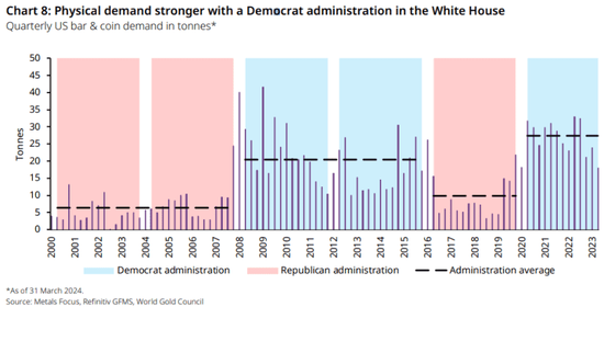 报告称,调查结果“表明,无论是出于人口结构、政治派别还是更广泛的经济担忧,实物黄金需求在民主党政府执政期间往往会增加。”