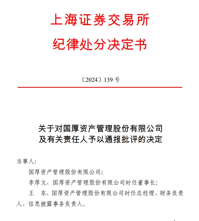 7月22日,上海证券交易所官网公布,关于对国厚资产管理股份有限公司及有关责任人予以通报批评的决定。