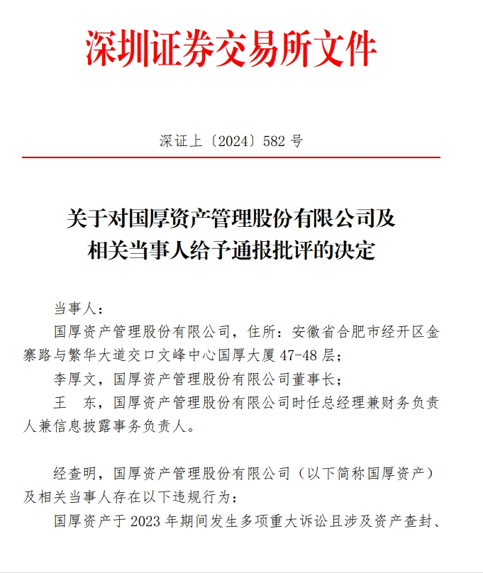 基于此,深交所对国厚资产及其董事长李厚文和时任总经理王东,做出通报批评的处分。此决定记入诚信档案。