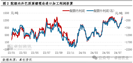 【导语】由于年进口糖成本下降导致进口利润增加,2023/24年度进口糖同比出现增量趋势。5月以来配额内进口加工利润再度扩大,配额外进口窗口一度打开,或导致7月起进口糖数量增幅明显,三季度进口或迎来高峰期,2023/24年度进口糖增量成事实。