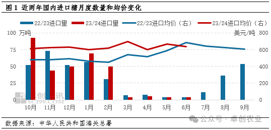 中华人民共和国海关总署数据显示,截至6月,2023/24年度中国累计进口糖316万吨,较上年同期增加10.1%。2023/24年度的前五个月进口量集中,累计进口305万吨,同比增加15.09%。2024年3-6月单月进口量不足6万吨,处于季节性进口淡季,但3月以后进口均价小幅下降,6月进口均价634.62美元/吨,环比下降4.86%,同比下降7.5%。