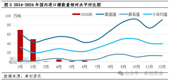 根据近十年国内进口糖月度数量变化规律来看,一般上半年进口处于相对淡季,下半年进口量集中,尤其三季度进口增量明显。这也与国内白糖生产季节性规律相符合,上半年国内制糖季,糖厂处于累库高峰期,市场走货以国产糖为主,进口许可一般也是在二季度陆续发放。