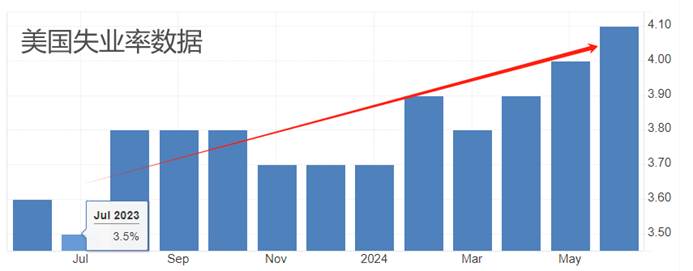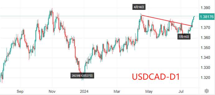 2023年7月份,美国失业率创出阶段性低点3.5%,之后开启持续上升。直至今年6月份,失业率上升至4.1%,创出2021年12月份以来的新高。健康的失业率标准是5%以下,美国的数据仍处于健康状态,但不断升高的趋势令市场无比担忧。如果下周非农就业报告的失业率数据再次升高,美联储降息的预期将再次增强,USDCAD的上涨势头或将阶段性停止。