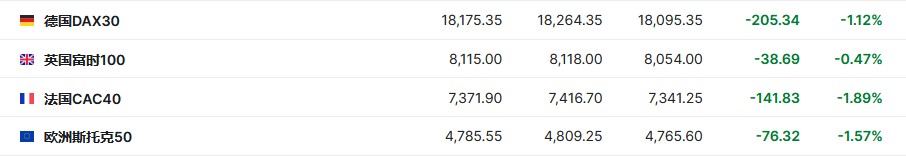 2. 截至发稿,德国DAX指数跌1.12%,英国富时100指数跌0.47%,法国CAC40指数跌1.89%,欧洲斯托克50指数跌1.57%。