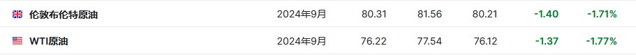 3. 截至发稿,WTI原油跌1.77%,报76.22美元/桶。布伦特原油跌1.71%,报80.31美元/桶。