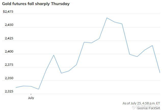 在这种背景下,8月交割的黄金价格在Comex下跌了62.20美元,或2.6%,收于每盎司2353.50美元,最低交易价为2351.90美元。这是自7月3日以来的最低盘中水平。此前黄金连续两日上涨,并在7月17日创下了2488.40美元的新盘中历史高点。